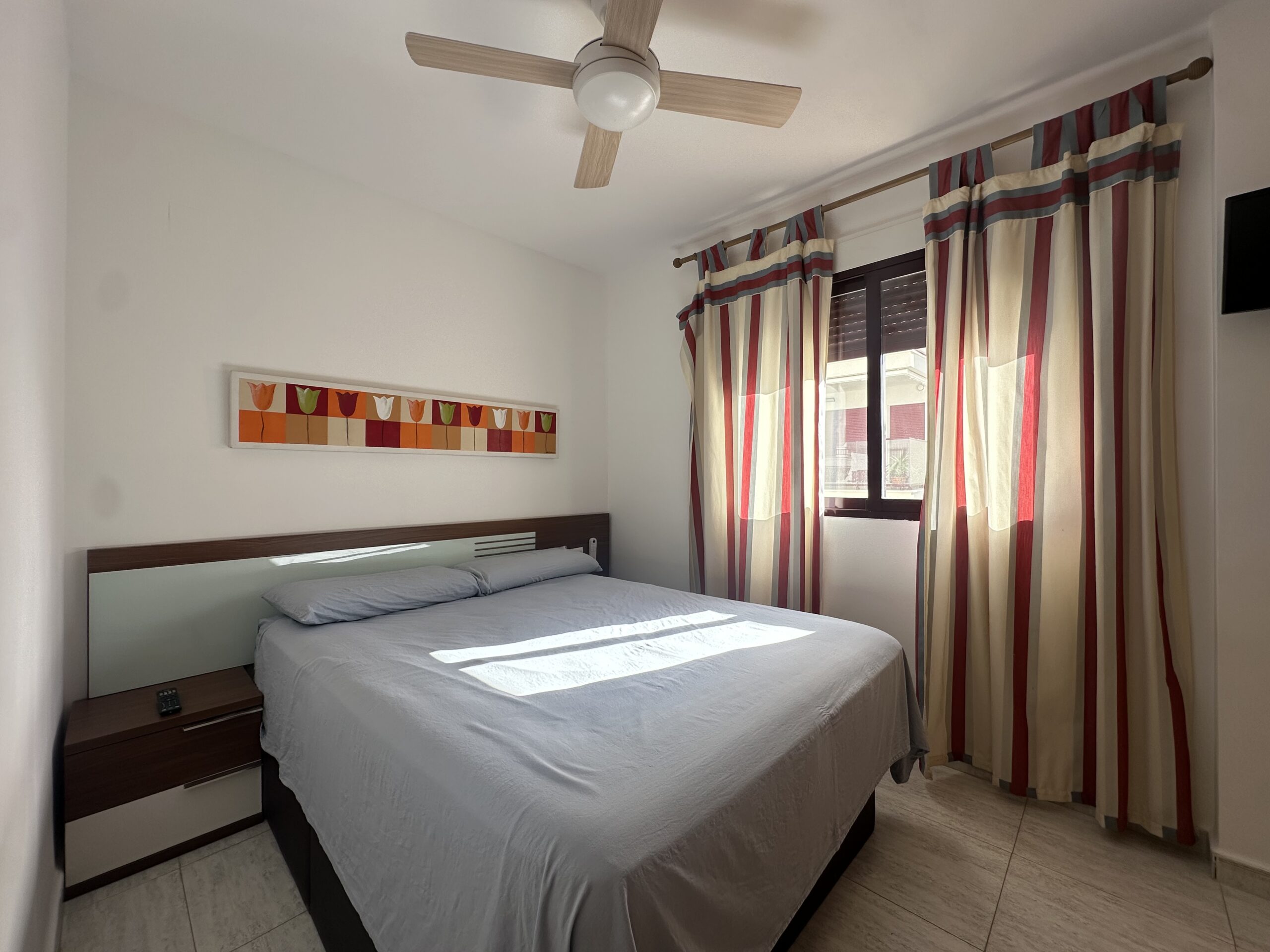 El apartamento cuenta con dos dormitorios: el dormitorio principal dispone de cama de matrimonio y baño en suite, ofreciendo un espacio íntimo y cómodo.